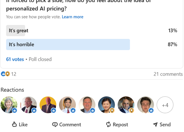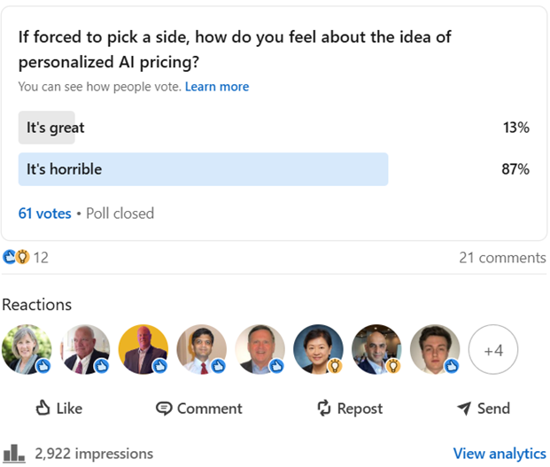 After taking a number of warmth, Delta clarified that they haven’t any intention of utilizing surveillance pricing (see right here and right here). Rather, they will use AI to additional automate their traditional pricing and income administration approaches. For instance, permitting AI to regulate obtainable fare lessons in close to actual time. After extra analysis, I noticed the reality was a traditional analytics or AI use case: automating and scaling processes that historically relied closely on human involvement. I posted a comply with up acknowledging my error (see right here). It was additionally seen by ~3,000 folks, however a lot of these 3,000 had been actually not the identical ones who noticed my preliminary submit. Thus, there are many folks I misled that didn’t see my correction.